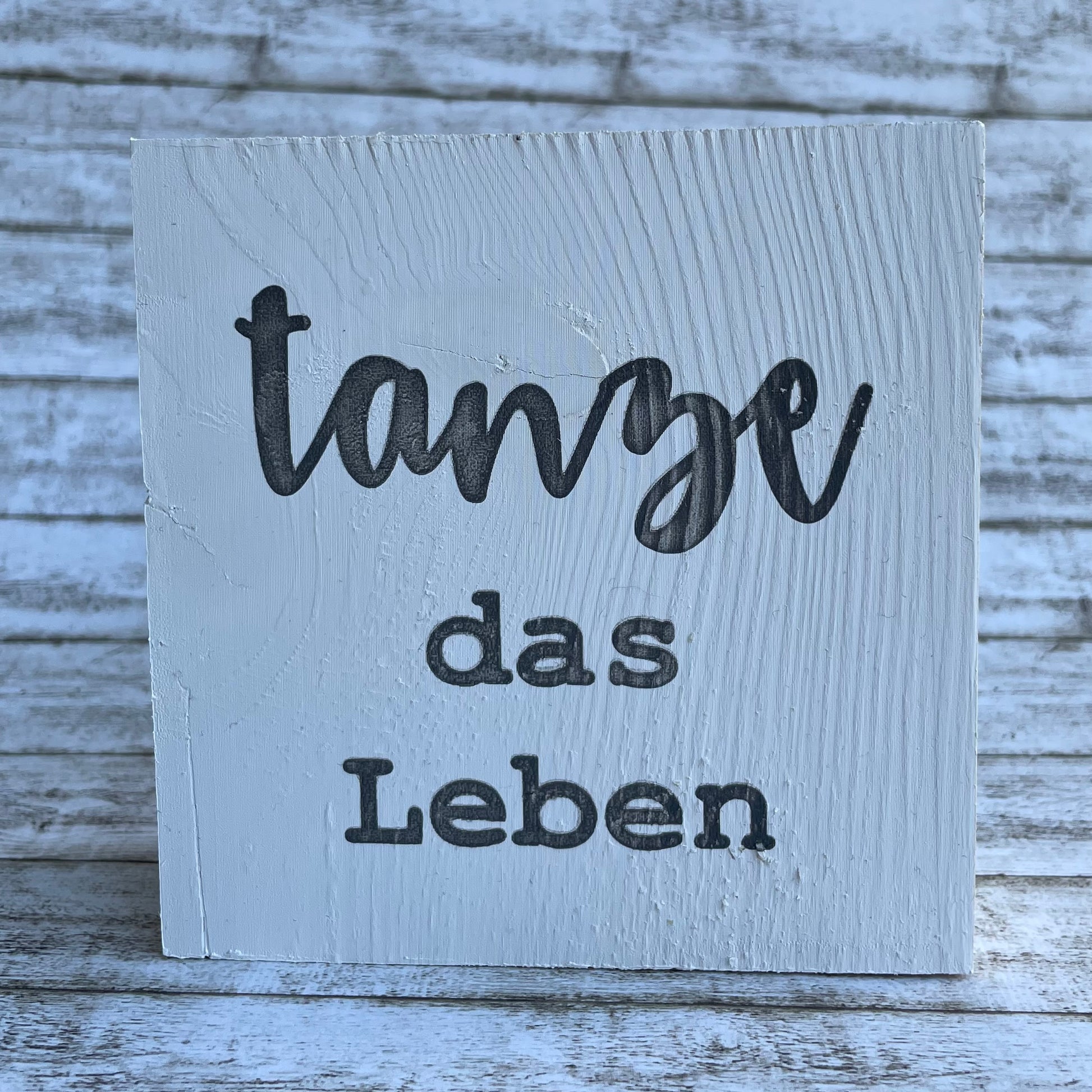 Handbedruckter Holzblock (Massivholz), ca. 12x12x2,7cm, Vorderseite weiß und mit Siebdruck in grau, feucht abwaschbar.