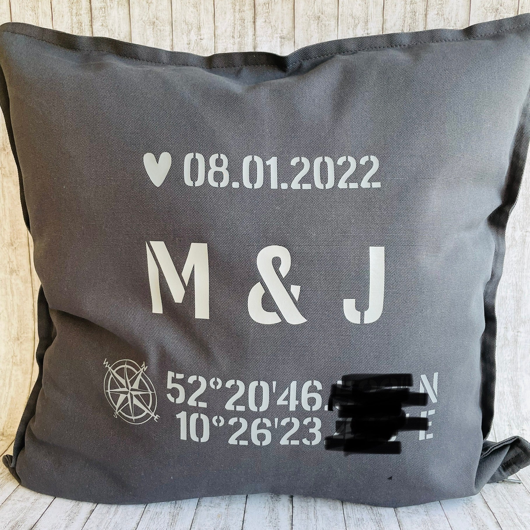 Kissen "Liebe" - in diesem Kissen sind verschiedene Meilensteine einer Beziehung versteckt. Die Initialen des Paares, das Kennenlern-Datum und der Kennenlernort als GPS-Daten. Bitte gib' mir deine Informationen, die auf das Kissen sollen, über das Kontaktformular bekannt, damit ich dir dein Unikat erstellen kann.